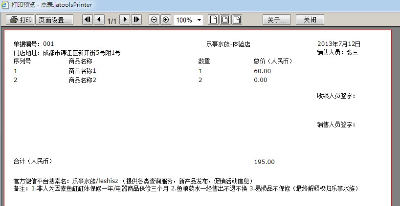 原贴:http://www.shuijingwanwq.com/tag/jatoolsprinter/ 最近为了要在web页面上通过直接点击打印按钮,便开始打印相应的单据,分析了几个web方面的控件,最终决定采用jatoolsPrinter的免费版本。 其中ReYoPrint在IE10下面是有问题的,明显只有一页,其却判断出来了九页,是有问题的了。而ScriptX却是没有配置出来比较理想的格式,也暂时不清楚是哪儿出了问题的。Lodop却是没有免费的版本的,不过其收费版本,基于域名的不要发票也不贵的哈。才210元的。 不过由于公司不希望购买收费版本,所以说是终采用了jatoolsPrinter的免费版本,以便打印出相关的单据。一个问题便是其边距好像设置为0的时候没有效果,因此只能够尽量设置得小一些了的。另外一个问题便是打印预览是正确的,可是打印出的单据却是最左侧少了一些内容,不得不通过调整html的格式,margin-left让左边有了一些间距,才解决了此问题的哈!上传一张预览图: